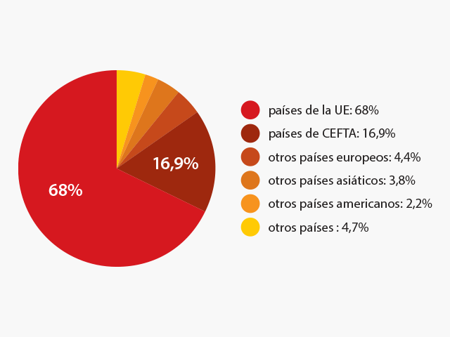 En la exportación la más representada es la industria manufacturera que representa el 81%. En 2021 las principales actividades exportadoras fueron relacionadas con los productos alimenticios (9,5%), equipamiento eléctrico (9,4%), productos de metal finalizados (8%), máquinas y dispositivos (6,9%), productos químicos (6,9%), productos farmacéuticos (6,6%), coque y productos de petróleo (6%), madera y productos de madera (5,9%), metal (5,2%), ropa (4,6%), vehículos motorizados (4,1%), productos de caucho y plástico (4%), productos minerales (3,9%), ordenadores y equipos informáticos (3,7%), cuero (2,8%), papel (2,3%), muebles (1,8%), textil (1,2%), bebidas (1,1%), productos de tabaco (1%).