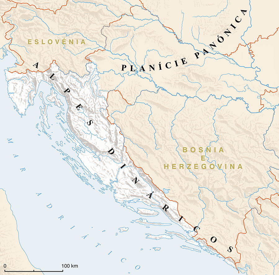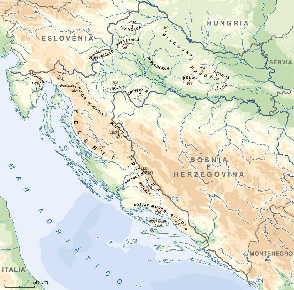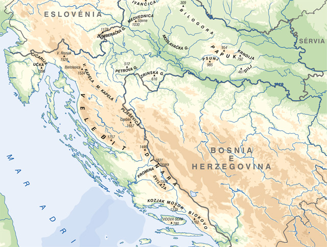 Mais a oeste, das terras baixas erguem-se montanhas isoladas e florestadas com alturas abaixo dos 1000 m (Psunj, Papuk, Krndija, Požeška Gora). A parte marginal da Planície Panónica faz a transição para uma área peri-panónica montanhosa com uma proporção significativa de montanhas, que em alguns locais ultrapassam os 1000 m de altura absoluta (Medvednica, Ivanščica, Žumberačka Gora). A transição para a área montanhosa é composta por colinas e planaltos de formações calcárias em Pokuplje e Kordun. A verdadeira área montanhosa inclui Gorski Kotar e Lika e faz parte dos Alpes Dináricos que se estendem entre o noroeste e o sudeste, com as montanhas mais altas nas margens (Risnjak, Mala e Velika Kapela, Plješivica, Velebit, Dinara). Em Gorski Kotar, existe um forte contraste entre a parte montanhosa e os vales profundos dos rios Čabranka, Kupa e Dobra. No interior de Lika, encontram-se vastos campos cársticos (Plaščansko, Gacko, Ličko, Krbavsko).