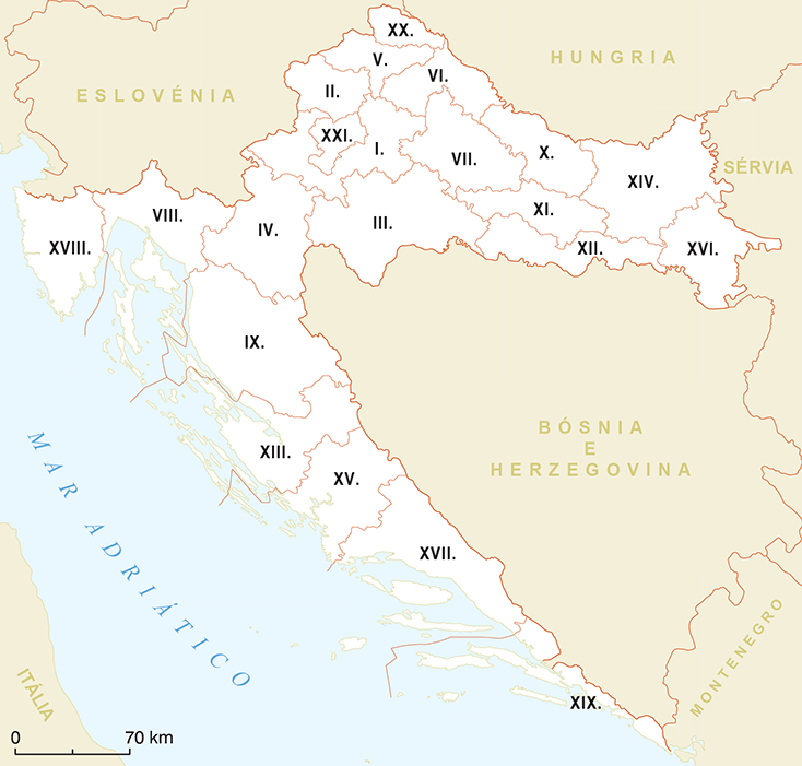 Com a mudança na divisão administrativo-territorial, os condados foram reintroduzidos em 1990 como uma unidade de autogoverno regional. A Croácia está, portanto, dividida em 21 condados, incluindo a cidade de Zagreb, que possui o estatuto especial de cidade e condado. Unidades menores (locais) dentro de um condado são cidades e municípios. A Croácia tem 128 cidades e 428 municípios.