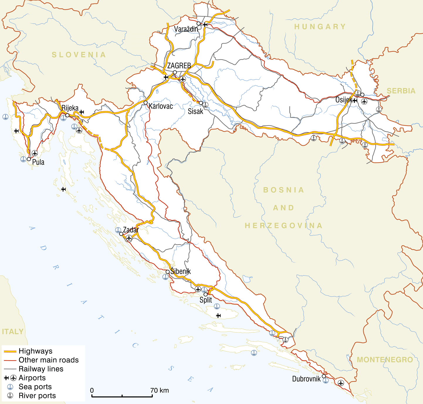Der Straßenverkehr ist die am stärksten entwickelte und die bedeutendste Form des Landverkehrs, im Rahmen dessen der Großteil der Personen und Güter befördert wird. Das bestehende Autobahnnetz ist gut entwickelt und schafft Voraussetzungen für gute Verbindungen innerhalb des Landes sowie mit dem Ausland. Etwa 1000 km moderne Autobahnen sind seit dem Jahr 2000 gebaut worden, und zwar auf den internationalen Verkehrskorridoren. Kroatien verfügt über 9 Flughäfen (Zagreb, Split, Dubrovnik, Zadar, Pula, Rijeka, Osijek, Brač, Mali Lošinj). Im Verkehrsnetz kommt eine besondere Bedeutung den Seehäfen zu. Der wichtigste und größte kroatische Seehafen ist der von Rijeka, gefolgt vom Industriehafen Ploče, über welchen der gesamte Seeverkehr von Bosnien und Herzegowina abgewickelt wird. Die restlichen Adriahäfen spielen vor allem im Passagierverkehr und in der Verkehrsanbindung des Küstengebiets mit den Inseln eine bedeutende Rolle. Die Gesamtlänge der Binnenwasserstraßen beläuft sich auf 804,1 km, wobei der internationale Verkehr in erster Linie über die Donau (der bedeutendste Binnenhafen ist Vukovar) und im geringeren Ausmaß über ihre Nebenflüsse Drau und Save abgewickelt wird. Übrigens ist der Donau-Schifffahrtsweg, an dem Kroatien ebenfalls zum Teil liegt, eines der Paneuropäischen Verkehrskorridore (Korridor VII). Durch das geplante Projekt, den Ausbau des Donau-Save-Kanals, sollten betreffende Wasserwege verkehrstechnisch miteinander verbunden werden.
