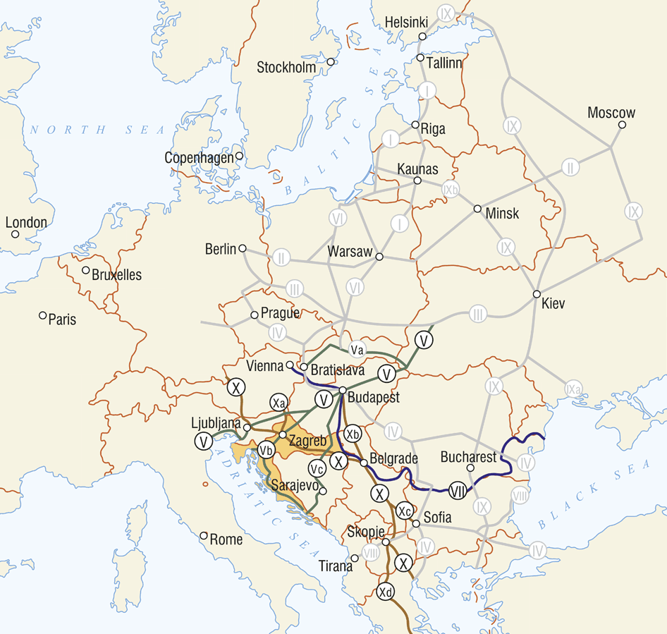 Als adriatisches sowie mitteleuropäisches Land und zudem Donauland genießt Kroatien eine vorteilhafte geografische Verkehrslage. Folglich durchqueren Kroatien einige paneuropäische Verkehrskorridore und ihre Nebenzweige, die im Jahr 1997 auf der Konferenz der europäischen Verkehrsminister in Helsinki festgelegt wurden: der Verkehrskorridor X verbindet Mitteleuropa mit dem Nahen Osten, während die Teilläste des Verkehrskorridors V sowohl den Norden als auch den Süden Europas mit den kroatischen Häfen als Endbestimmungsorten verbinden.