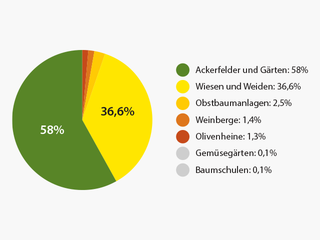 Die landwirtschaftliche Nutzfläche Kroatiens erstreckt sich auf insgesamt 1,5 Millionen Hektar, von denen rund 0,9 Millionen Hektar als Ackerland genutzt werden, während der Rest auf Wiesen und Weiden entfällt. Eine Vielfalt unterschiedlicher Klima-, Relief- und Bodentypen ermöglicht die Herstellung eines breiten Sortiments an landwirtschaftlichen Produkten; von Ackerbau- und Industriepflanzen bis zu den Weinbergen und dem Anbau von kontinentalen und mediterranen Frucht- und Gemüsesorten. Der Ackerbau deckt den gesamten heimischen Bedarf an Getreide, Ölsaaten und Zucker sowie den vorwiegenden Bedarf an Industriepflanzen. Kroatien ist ein Land des Weinbaus, in dem sowohl kontinentale als auch mediterrane Traubensorten gedeihen, von denen einige sogar autochthon sind. Die Weinberge erstrecken sich auf einer Fläche von 21.000 Hektar, auf der im Jahr 2021 rund 765.000 Hektoliter Wein erzeugt wurden.