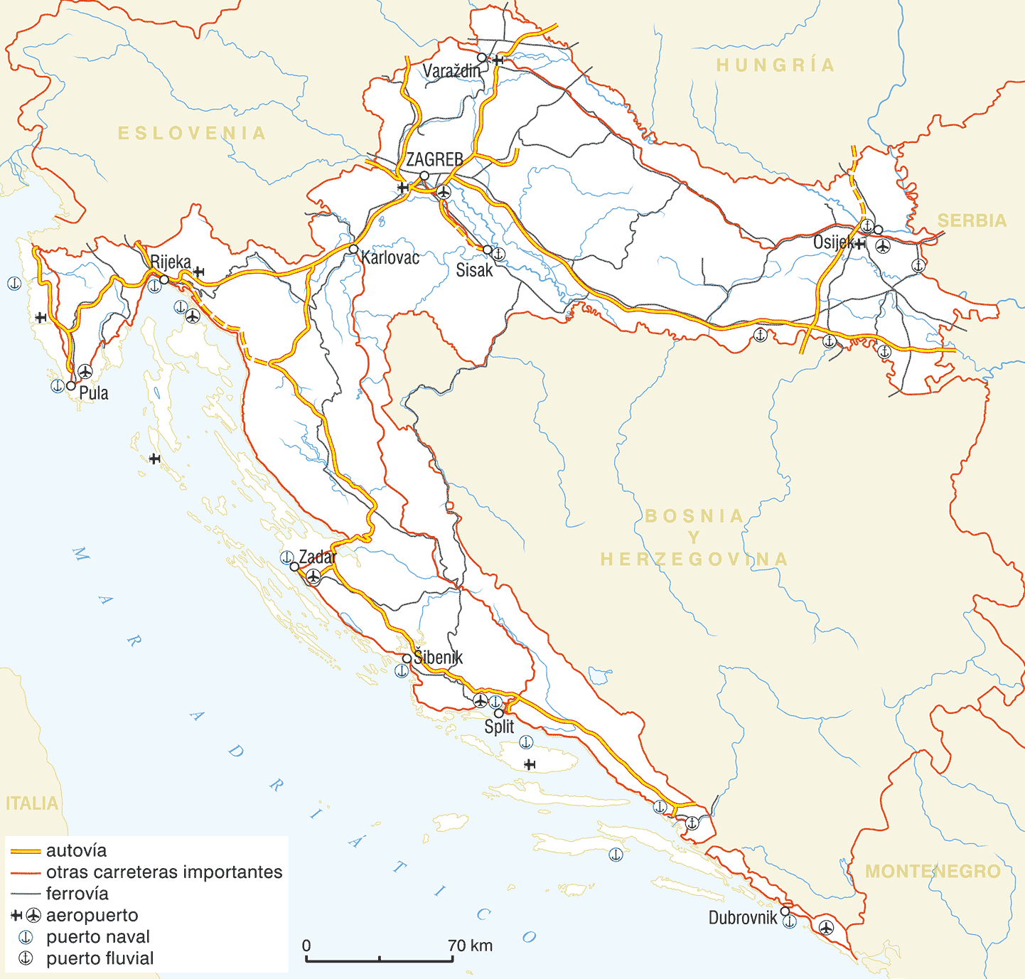 El tránsito vial es la forma más desarrollada y más relevante del tránsito terrestre, que transporta la mayor cantidad de personas y mercancía. La existente red de autovías está bien desarrollada y posibilita una buena comunicación dentro del país y también con el exterior. Alrededor de 1.000 km de autovías modernas fueron construidos después de 2000, justamente en los corredores internacionales. Croacia cuenta con 9 aeropuertos (Zagreb, Split, Dubrovnik, Zadar, Pula, Rijeka, Osijek, Brač, Mali Lošinj). Los puertos marítimos tienen un significado especial en la red de tránsito. El más importante y el más grande puerto croata es el de Rijeka, seguido por Ploče, por el cual pasa todo el tránsito a Bosnia y Herzegovina. Otros puertos adriáticos son importantes para el tránsito de viajeros y la comunicación entre las islas y la tierra firme. La longitud total de vías fluviales navegables es de 804,1 km, y el tránsito internacional se lleva a cabo mayormente por el Danubio (el principal puerto de Vukovar) y en menor medida por los ríos Drava y Sava. La vía fluvial navegable del Danubio en la que participa Croacia es uno de los corredores de tránsito paneuropeos (Corredor VII). Para la comunicación entre las vías fluviales navegables hay un anteproyecto del canal Danubio–Sava.