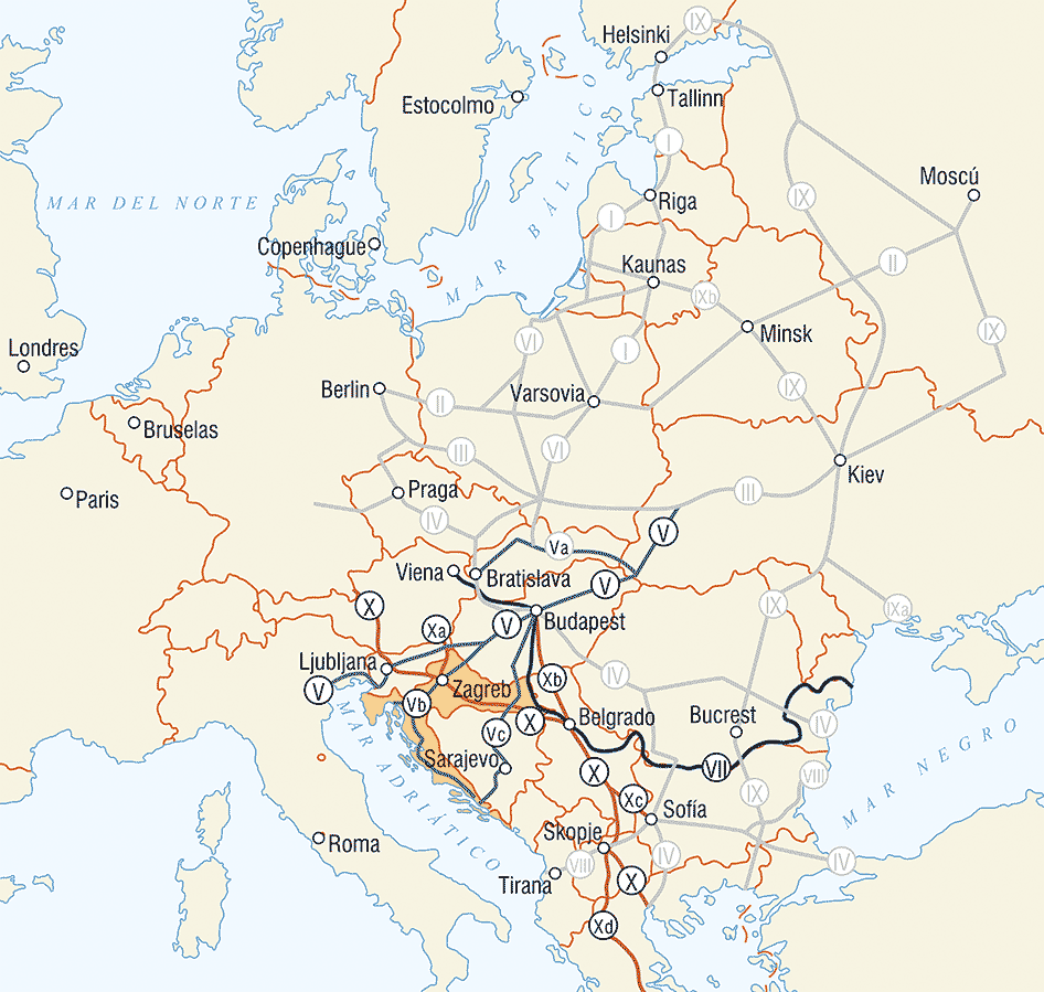 Como un país adriático y centroeuropeo, pero también de la cuenca del Danubio, Croacia tiene una favorable posición geográfica y de transporte. Varios corredores de tránsito paneuropeos y sus ramas pasan por Croacia, definidos en la Conferencia Ministerial de Helsinki en 1997: el Corredor X comunica Europa Central con el Próximo Oriente y las ramas del Corredor V comunican el norte y el sur de Europa con los puertos croatas.