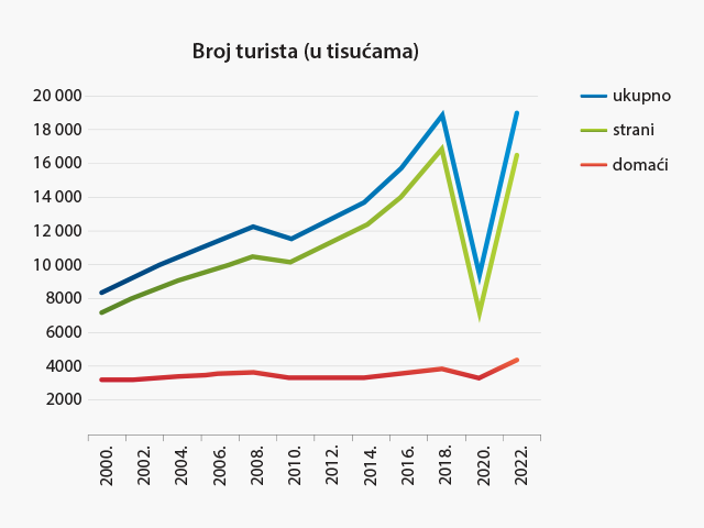Promet i turisti. U posljednjih tridesetak godina turistički promet obilježavaju tri bitno različite etape. U drugoj polovici 1980-ih broj turističkih dolazaka nastavio se kretati ujednačenim trendom povećanja te je prešao 10 milijuna. Potom je slijedila etapa Domovinskoga rata, u kojoj je, posve razumljivo, broj turističkih dolazaka strelovito pao (1991. i 1992. zabilježeno je manje od 2,5 milijuna turističkih dolazaka). U poslijeratnom razdoblju taj broj opet raste, pa se broj turističkih dolazaka od 2000. udvostručio (2019. zabilježeno je oko 20 milijuna dolazaka), izuzevši 2020. i 2021, kad je zbog pandemije uzrokovane koronavirusom znatno umanjena turistička putovanja (7 milijuna dolazaka). S oko 8 milijuna dolazaka te više od 90 milijuna turističkih noćenja u 2022, Hrvatska se ponovo uspješno pozicionirala na globalnoj turističkoj karti.