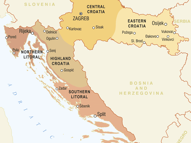 クロアチアの南部海岸地域はダルマチアという歴史的地域である。気候、風景、文化の面では、それは真の地中海地域であり、島、海岸と後背地の3つの平行な帯に区別することができる。この地域の中心はクロアチアの中で2番目に大きく、沿岸部では最大の都市であるスプリトである。その他の重要な地域・経済の中心には、沿岸のザダル、シベニクとドゥブロヴニク、そして内陸にあるクニンとシニがある。