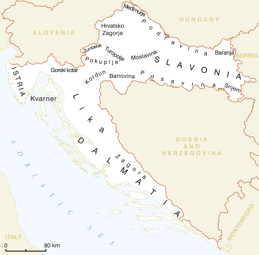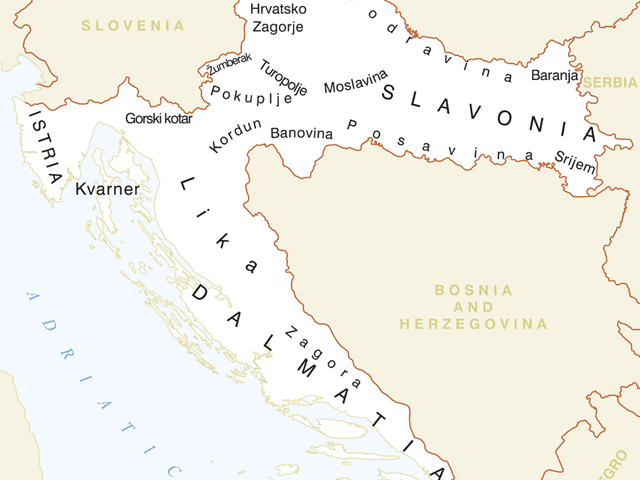 現代クロアチアの領域は、その起源や範囲の異なる多くの歴史的・地理的地域を抱える。これらは過去のクロアチアの政治的不統合と、一部ではヨーロッパを構成する基本的な地理的要素の接点にあるクロアチアの位置も反映している。最もよく知られている歴史的地域はダルマチア、スラヴォニアとイストリアである。